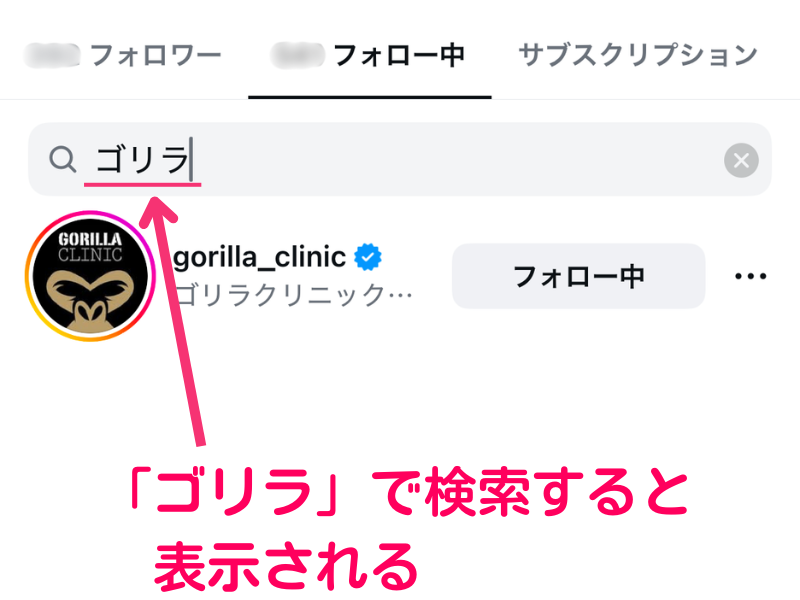 フォローしている画面を出すときは、自分のプロフィールの「フォロー中」から「ゴリラ」で検索するとすぐに表示されます。