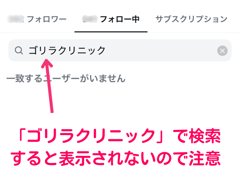 フォローしたゴリラクリニックの公式アカウントは、検索窓に「ゴリラ」と入力すれば、見つかりますが、「ゴリラクリニック」と入力しても出てこなかったので、注意してください。